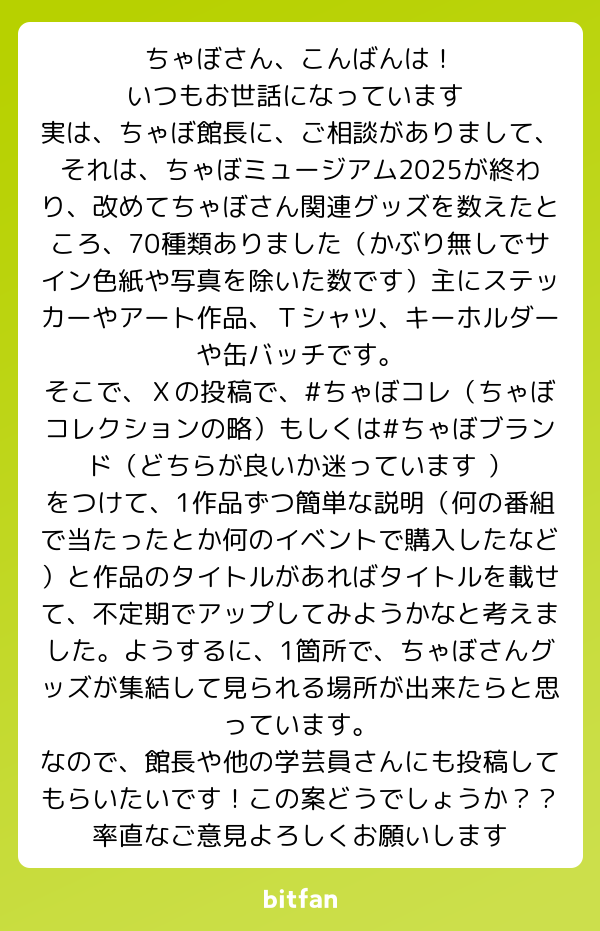 質問 マサ 2025/12/22 20:57 たくさんのグッズを持ってくださっていてありがとうございます!!! #ちゃぼコレでSNSに上げてくださると嬉しいです!!! よろしくお願いいたします!!! 質問・リクエストを送る URLをコピーする 報告する